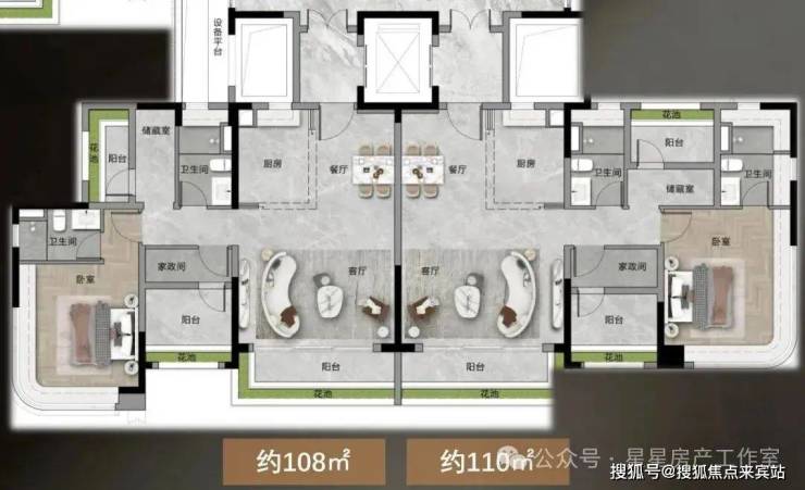 108㎡三房两厅两卫:西南朝向,竖厅设计,动静分区,有一个较大的入户花园,客厅主阳台有一个 270 度观景阳台,主人房也有一个 270 度弧形飘窗,视野采光一流。