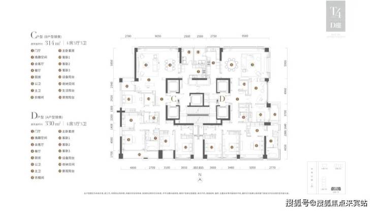 B/C户型:330m²四房三厅四卫,南北通透(卧室全南向)
