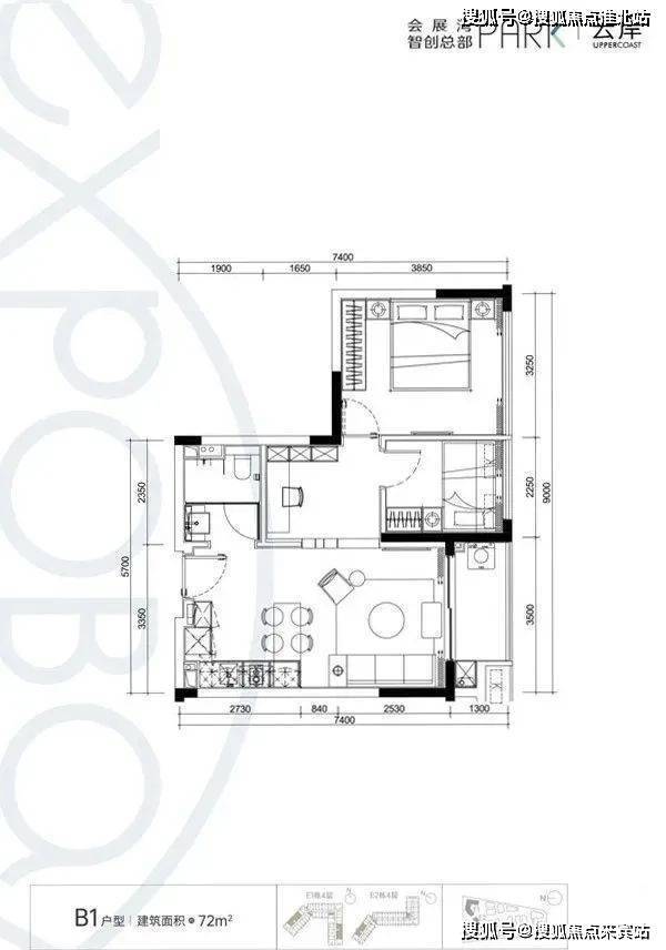 【B1户型:72㎡】房型:2+1房一厅一卫朝向:E1、E2(西北、东南)