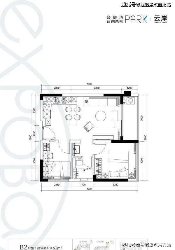 【B2户型:63㎡】房型:两房一厅一卫朝向:E1、E2(西南、东南)户型优势:端头位、双面采光、无敌景观