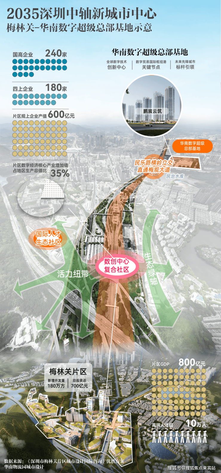 极致的区位:鹏宸云筑所在的区位梅林关片区,位于深港科技创新中轴中部,是龙华七大重点片区之一。