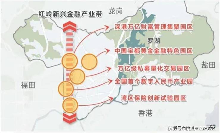 大湾区金融极:其中红岭新兴金融产业带作为"深圳三大金融增长极”之一,与前海国际金融城、福田香蜜湖金融街并列,罗湖将先天的金融优势及政府的政策支持,以金融产业赋能罗湖新发展,助力深圳成为大湾区经济发展引擎。( 信息来源:罗湖发布)