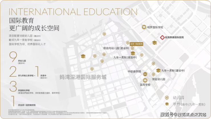 学校:楼下配备18班幼儿园,隔壁规划1所九年义务制学校;荟同,中欧等国际教育资源