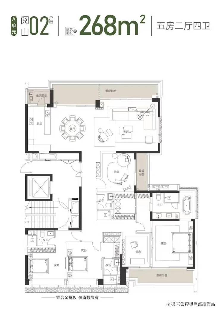 建面约268㎡的大平层户型,为五房四卫三套间设计,动静分区,将生活与居住空间相对分隔。