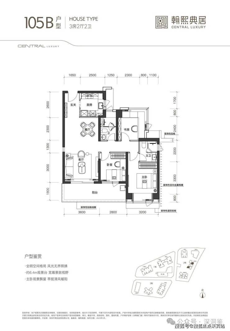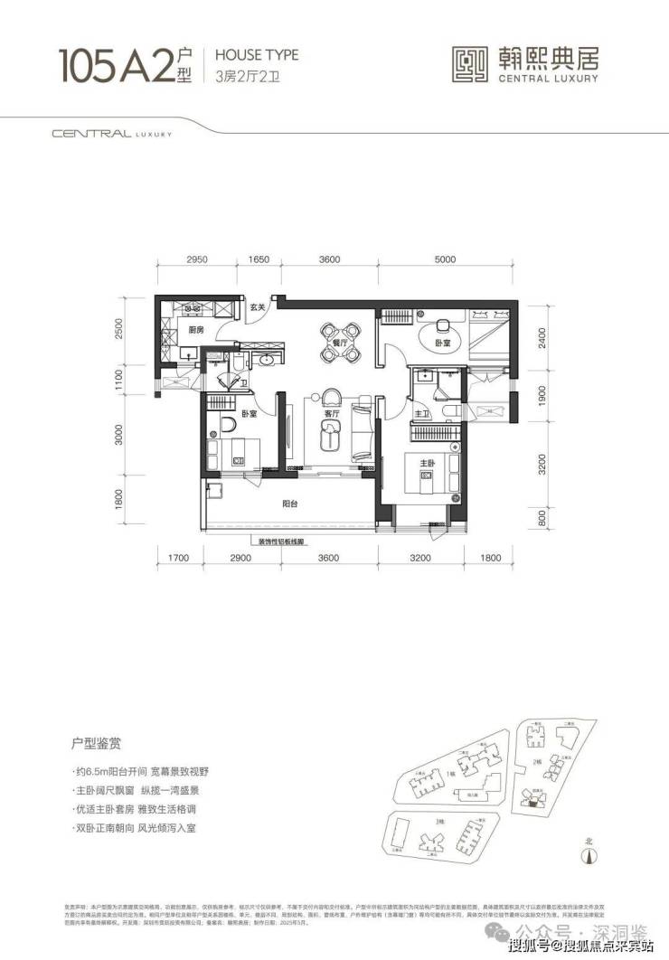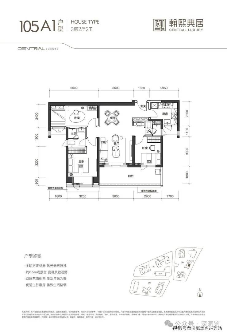 【建面105㎡3居】3室2厅2卫, 东南·南朝向,楼栋分布于2栋