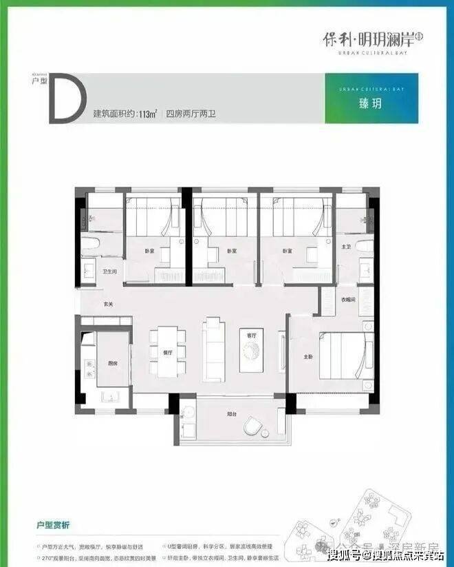 113㎡的4房2厅2卫,设计的是横厅南北通透格局,客餐厅实测5.89米开间,进门独户玄关,主卧大套间,U型厨房,公卫三段式分离设计,得房率:77.57%(不含赠送),主朝西南或东南向。