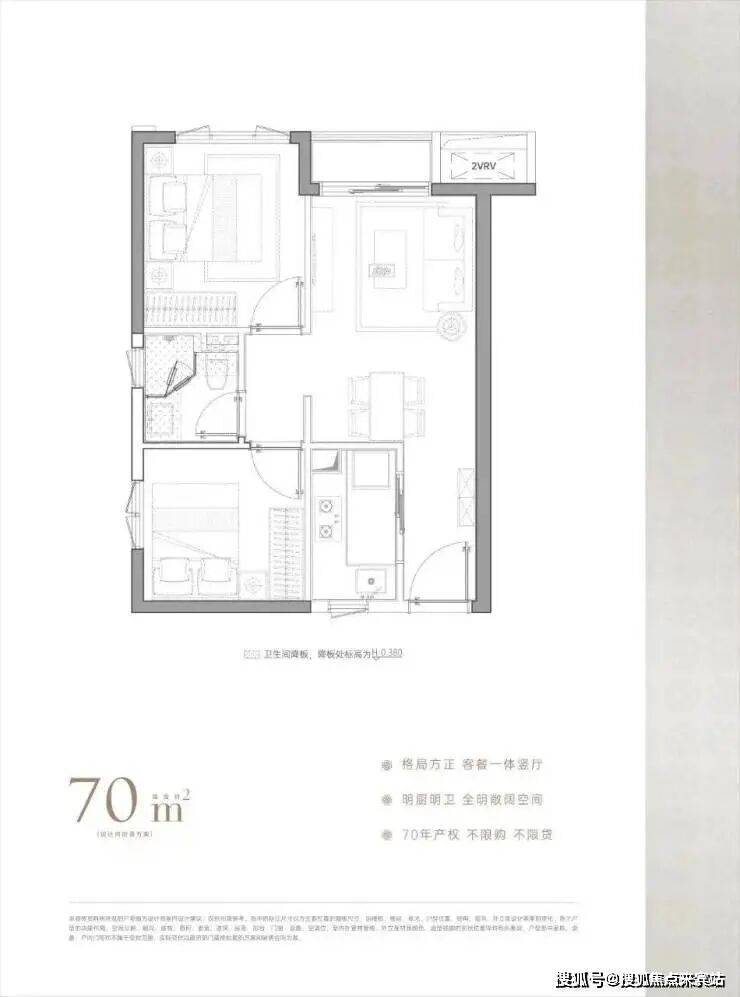 70平两房,竖厅格局,全明通透,通风采光及舒适度都是最好的,也比较贴近住宅家庭需求,功能空间开阔,拥有独立厨房和景观阳台。