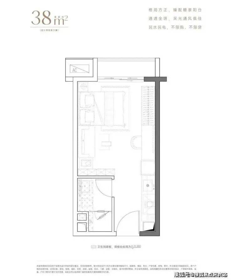38平单房,麻雀虽小但五脏俱全,带阳台通燃气,卫浴干湿分离,可改造为小两房。