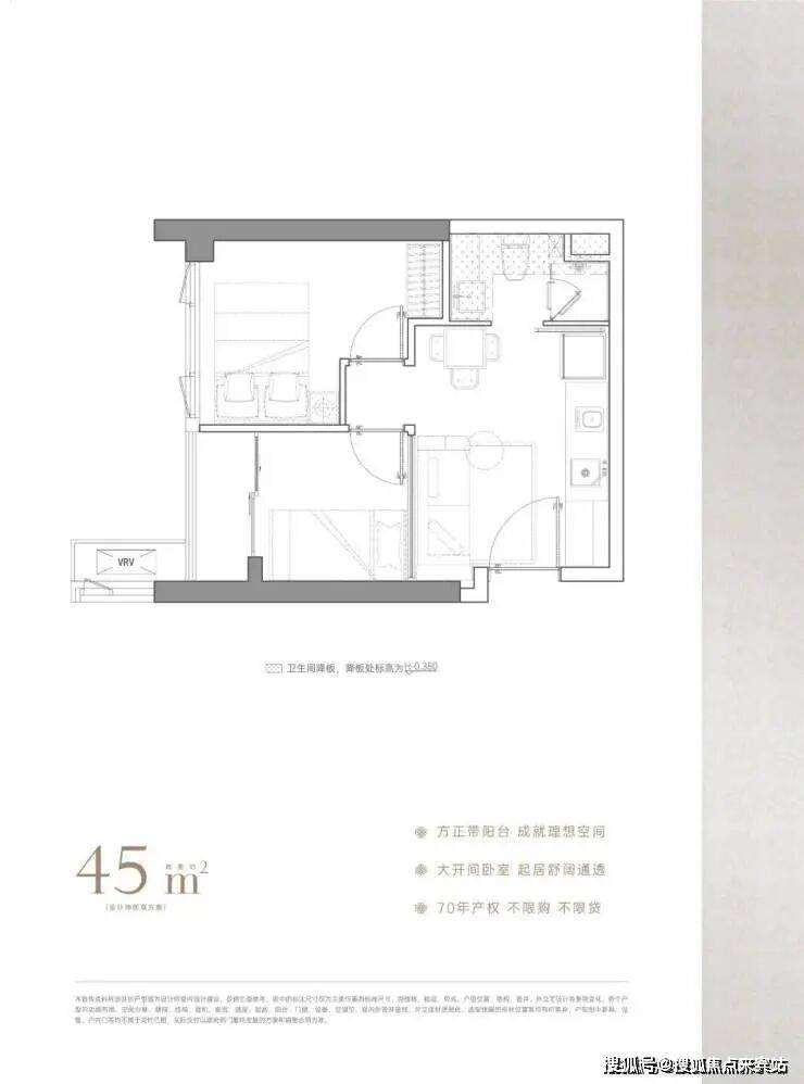 45-48平两房,主要特色是双卧室均有大面宽采光,明厨明卫,三分离卫浴设计,通透观景阳台提升空间感。
