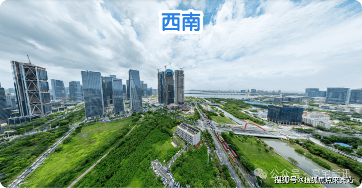 东北:楼下近距是公园绿地和双界河东段景观,远处看新安老城方向,整体远景城市景观为主。