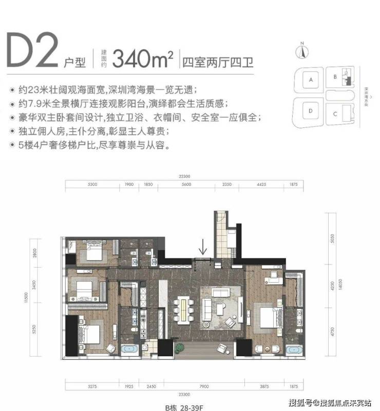 观景阳台:高区340平米户型,东面23米宽无敌海景视野(塔楼总观景面约46米)