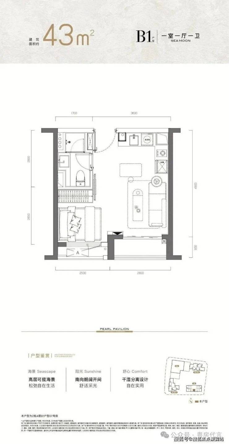 首推公寓389套,高度为35F,层高3.1米,户型为36-44-46-60㎡的1-2房。