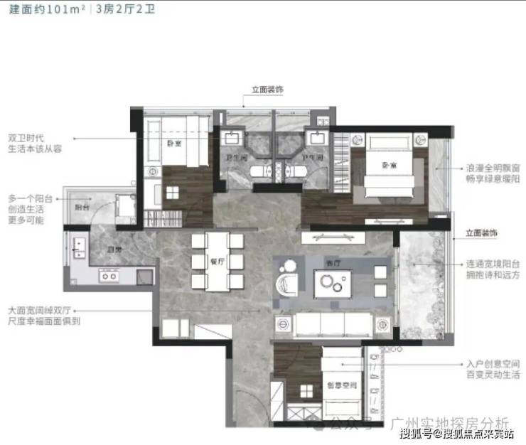 3、产品设计精细户型涵盖65-130㎡二至四房,满足不同家庭需求。部分户型采用横厅设计、干湿分离卫浴等,注重居住舒适度。外立面由真石漆、铝合金等材质打造,简洁现代。