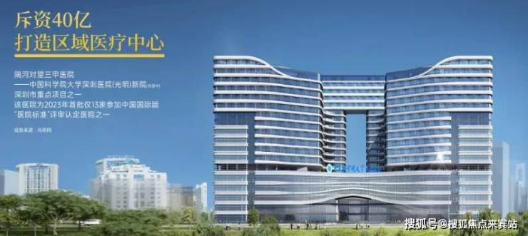 “中国科学院大学深圳医院(光明)新院”, 政府 投资 40 亿打造的三甲医院,未来将打造成区域医疗中心,是深圳市重点项目之一,预计2025 年建成并投入使用。项目用地面积约 5 万平方米,总建筑面积为33.7 万平方米,可提供床位 1500 个,将有效缓解群众看病难的问题。