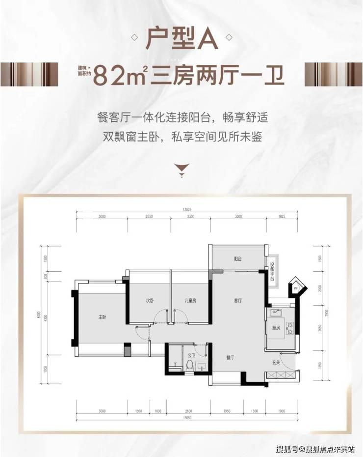 82㎡三房一卫,有通透和竖厅两种户型,均为东北朝向。