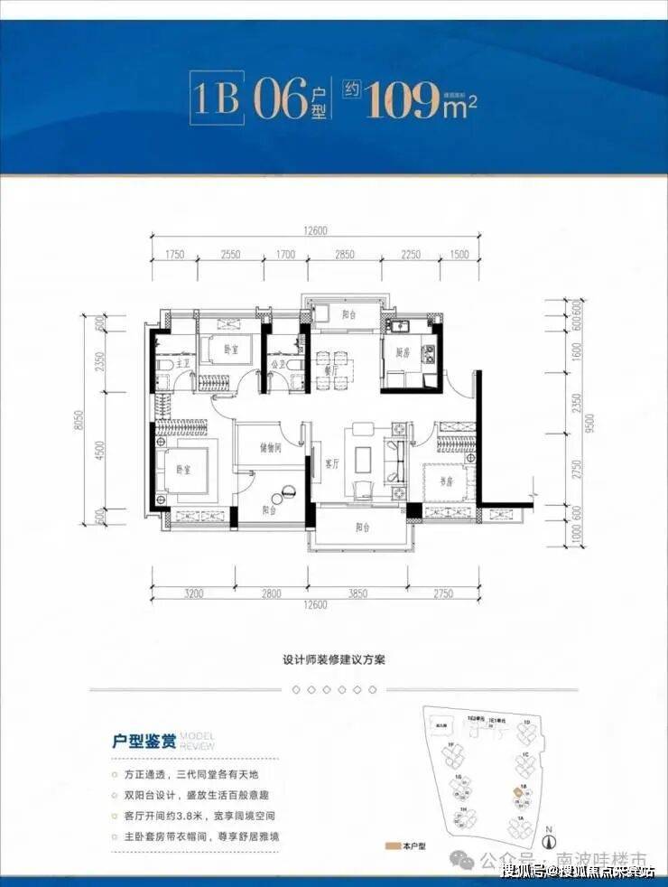 109平4房2卫,竖厅格局,南北通透/东南朝向,赠送面积14.41-16.43㎡,加赠送后得房率约92.82-94.67%。