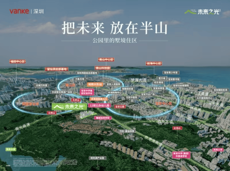 万科未来之光项目是万科联合人才安居集团打造的超30万㎡的理享生活大城。 未来之光项目直线距离前海不到6.5公里,受“南山+宝安”双核心辐射。从项目出发,开车仅半小时可到达深圳最主要的工作区域:宝安中心、留仙洞、南山科技园、前海后海、车公庙、福田CBD等。步行可达地铁5号线兴东站,规划中的地铁15号线被称作“深圳一环”,涵盖了会展新城、海洋新城、太空港片区、铁仔山科技城、宝中及大铲湾、前海核心区、留仙洞总部基地、尖岗山高新园、蛇口片区等大湾区乃至国家大力发展的产业片区。