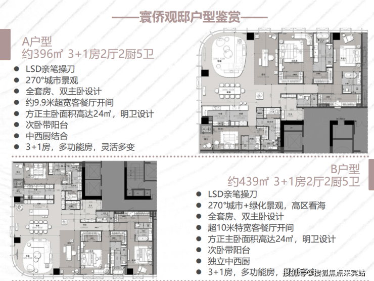4. 户型优势明显:大平层设计,户型方正,采光通风好,270°全景视野,空间宽敞舒适,,全套房、双主卧等设计满足了高端人群对居住品质的追求。