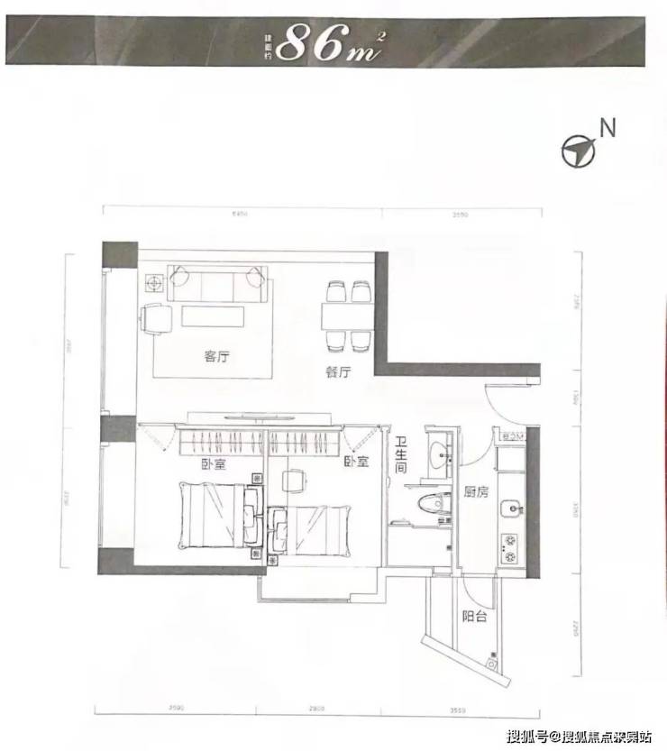 约 88㎡2 房 1 卫公寓:布局合理,空间利用率高,通燃气带阳台,居住舒适。