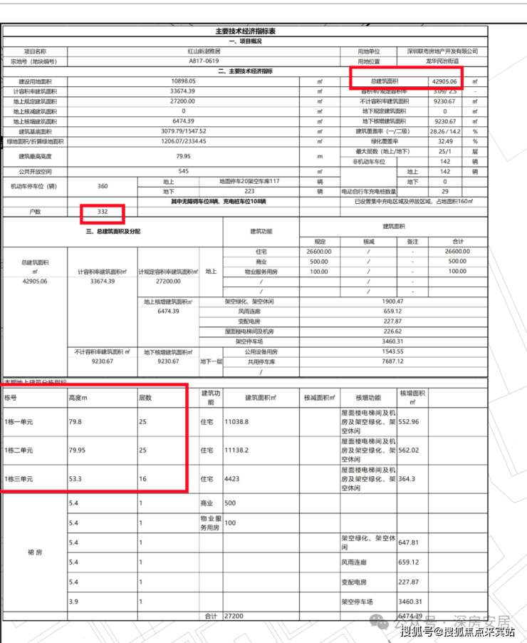 项目1栋1/2单元2梯6户,1栋3单元2梯4户设计,地下室有1层,规划360个车位,车位比1:1.08。