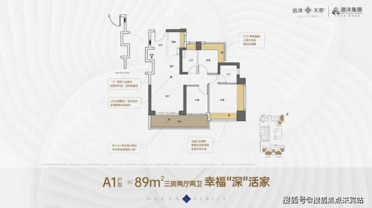89㎡的3房2厅2卫,A1户型,设计的是竖厅格局,客厅3.5米开间,LDKB一体化,S墙设计预留冰箱卡槽位,客厅连接次卧出5.9米长的大阳台,主卧双面飘窗,次卧270度转角飘窗,U型厨房,卫生间干湿分离,得房率约72.57%(不含赠送),阳台有朝西向、东向、南向。