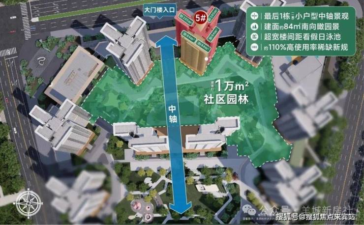 :中轴园景央座(5号楼)为最后一栋小户型望园林产品,每户均享约600㎡度假泳池、滨水景观带等社区配套视野。