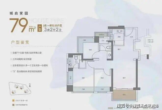 79㎡的3房2厅2卫,设计的是经典竖厅格局,LDKB一体化,S墙设计预留冰箱卡槽位,动静分区,三开间朝南,主卧+1个次卧270°飘窗设计,U型厨房,公卫三段式分离,得房率约90%(包含赠送),东南或西南朝向。