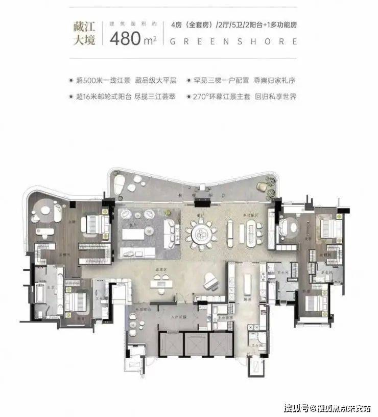 多元化产品线:涵盖140-480㎡江景大平层、叠墅(279-437㎡),其中叠墅实用率高达355%,配备私家电梯、入户花园及超大露台,部分户型首层花园达797㎡。