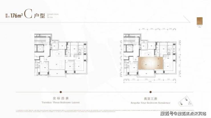 176㎡户型原报建是四房三卫(双套间)的南北通透户型,客厅开间5.7米,「招商海晏府」的定制方案是去除一个次卧2,打通成为茶室。