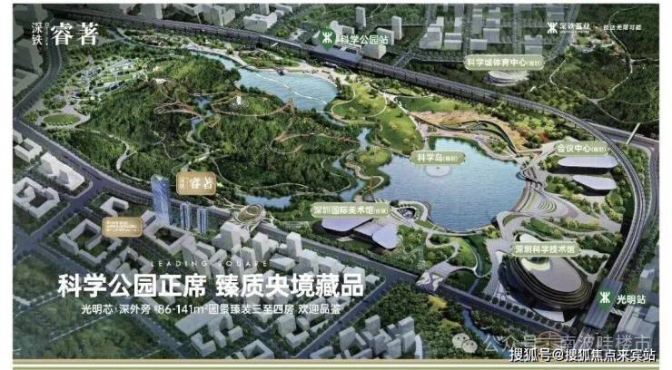 深铁睿著广场,位于光明区新湖街道光辉大道与华夏路交汇处东南角,地处光明中心区板块,紧邻占地208万平方米的科学公园,属于光明规划中“最宜居、居住板块最大”的片区。项目北侧与科学公园仅一街之隔,东、南侧为深圳小学光明学校狮山校区及初中校区,周边市政配套规划密集,如深圳科技馆新馆、国际美术馆等均在建设中,预计2026年前全面落成。