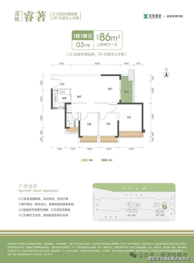 光明中心区,深铁睿著广场计划在2025年9月份取证入市,本次将推出1栋1/2单元,共229套房源,面积有86㎡的3房1卫,99-102㎡的3房2卫,112-141㎡的4房2卫户型,其中有88m²的户型整条腿都是人才房,而141m²的4房户型也仅有一条腿,极为稀缺,价格方面可以参考近期今年7月份开售的满京华金硕悦府,折后均价4.22万/m²,初步计划在2026年上半年带精装交房。