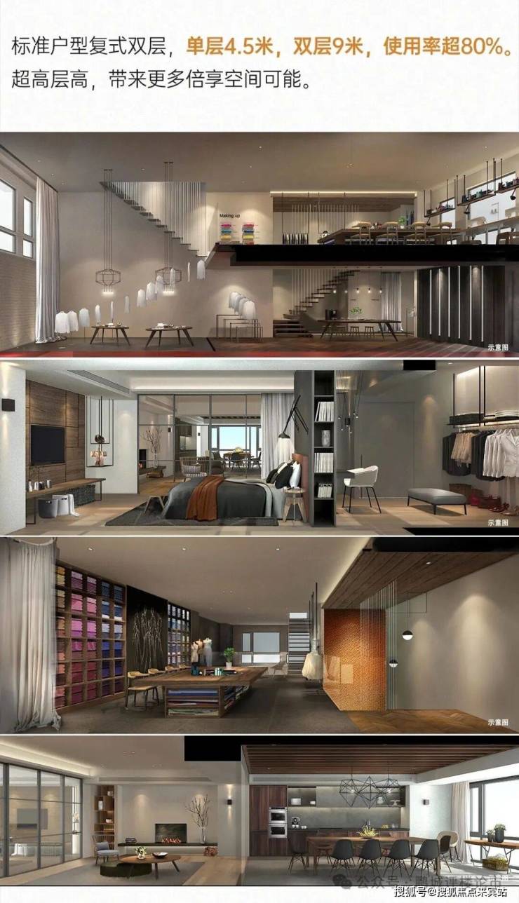 【层高】主力户型复式双层,标准层高4.5米,双层通高9米
