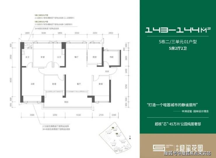 【五栋二单元-平面图】3梯4户,4条腿,01号房户型约144㎡的5房2厅2卫,02、03号房户型约96㎡的3房2厅2卫,04号房户型约115㎡的4房2厅2卫。