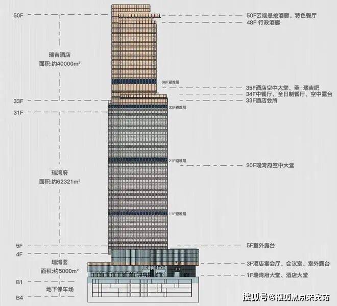 其中:瑞吉酒店位于项目33-50层,系深圳西部首家瑞吉酒店。作为高奢酒店,瑞吉秉承绝对私人的服务标准。