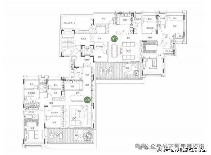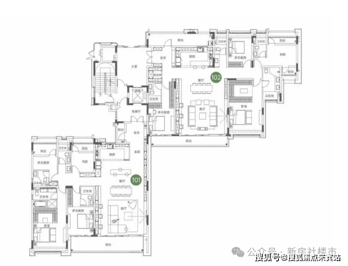 127-142平方米四房户型配备7米双联观景阳台,U型厨房与客餐厅一体化设计,主卧套房提升私密性。