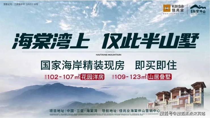 项目地址:三亚·国家海岸·海棠湾南田路佳兆业海棠伴山营销中心(方大太阳城南侧约15米) 开发商:三亚佰佳世纪房地产开发有限公司 物业公司:佳兆业美好物业 总建筑面积:59258.41㎡ 总计容建筑面积:44293.29㎡ 容积率:1.2建筑密度:24.83%绿化率:40.05%楼栋限高:24m 产权年限:70年 产品户数: 总434户,其中洋房301户,叠拼133户 产品信息: 建面约102-107㎡三室度假洋房,三房两厅两卫 建面约109-123㎡伴山揽景叠拼,三至四房两厅两卫规划架空层休憩空间,荟萃健身房、茶室、童趣娱乐空间等业主尊享休闲娱乐配套,构筑生活风雅大境。融儿童空间、休闲会所、有氧步道等丰富全龄休闲、运动配套与园林,打造惬意、健康的伴山生活体验。 将山地价值最大化,未来打造多重山地享法。伴山人生,尽情自在。 国家海岸海棠湾 千亿滨海配套群 海棠湾与蜈支洲岛隔岸相望。延绵约22公里醇美海岸线,聚集千亿旅游度假资源。以“国家海岸”战略的浓墨重彩,勾勒令世界倾慕的繁华图景。【32家超五星级酒店带】亚特兰蒂斯、华尔道夫、WJ万豪、洲际、四季、康莱德、威斯汀、香格里拉、瑰丽、艾迪逊…… 【天然矿泉】“神州第一泉”南田温泉 【国际医疗】301解放军总医院海南分院、北京广安门医院、北大口腔医院、哈佛医学院附属预防与肿瘤治疗医院、美国赫尔曼纪念TIRR康复医院、石药·德中医疗康复中心 【名校名师】中国人民大学附属中学 【餐饮畅购】海棠湾国际免税城(亚洲最大单体免税城)、君御68商业街、喜粤8号等四家米其林品牌餐厅、国内唯一黑珍珠双钻品牌四叶寿司…… 【缤纷休娱】亚特兰蒂斯水世界及失落水族馆(全球第三座)、海昌梦幻不夜城、宽窄巷子、太古里、HELLO KITTY主题乐园、水稻国家公园、海中海高尔夫球会、神泉国际高尔夫、铁炉港世界游艇码头、三亚当代艺术馆…… 【旅游胜地】蜈支洲群岛、椰子洲湿地、皇后湾群岛、海棠湾水稻国家公园……