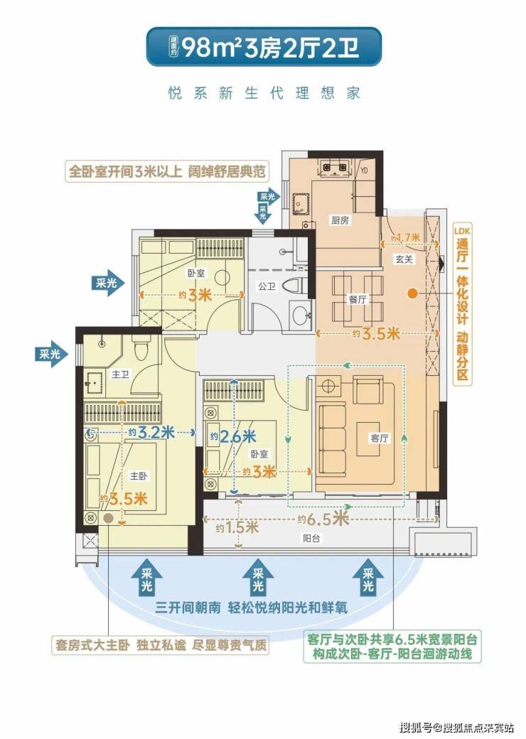 约 98㎡三房两厅两卫:改善型家庭的优选。同样是 LDK 通厅设计,搭配双开间超 6 米宽景阳台,阳台既能观景,又能作为休闲区,空间感十足;三面通风采光,全明无暗角;U 型厨房布局,操作动线合理,多人一起做饭也不拥挤,适合喜欢烹饪的家庭。