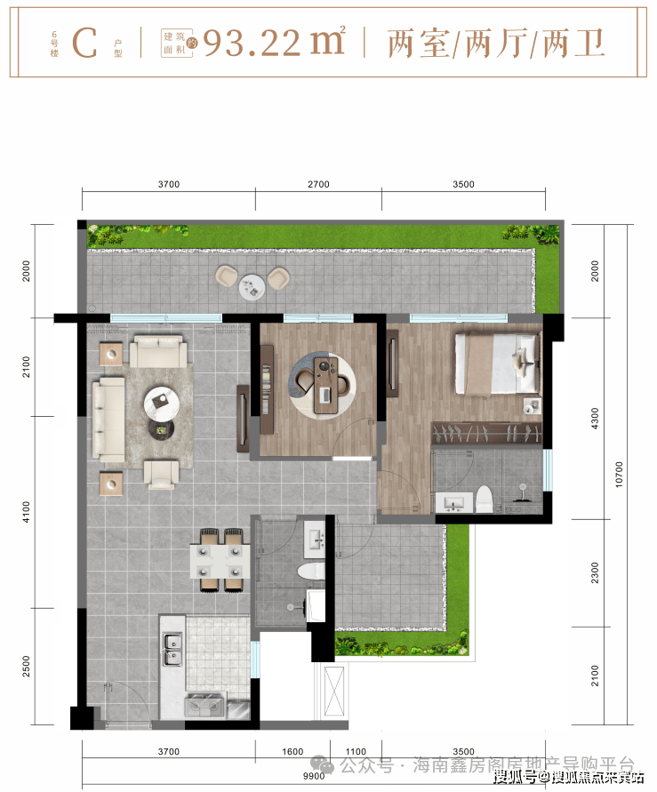 C户型约93㎡舒阔两房两厅两卫