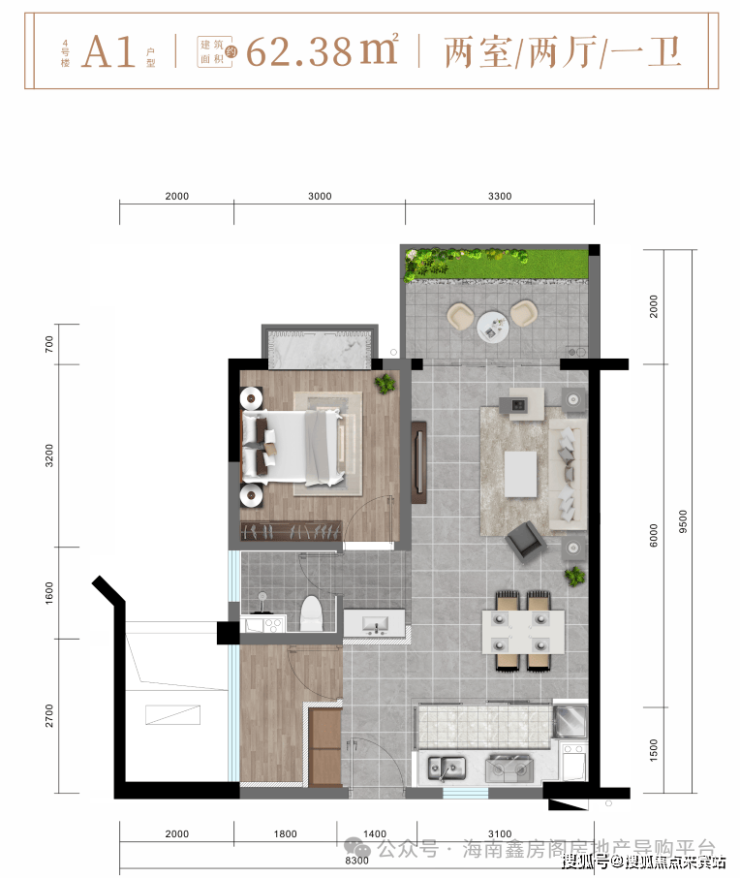 A1户型约62㎡精致两房两厅一卫