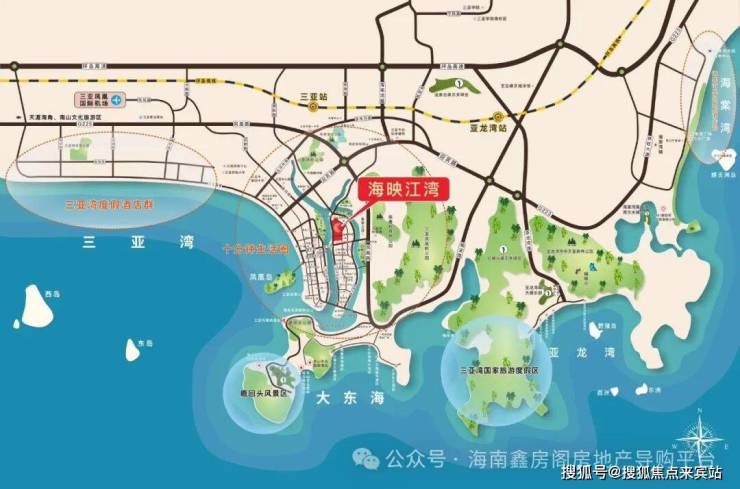 便捷交通:海映江湾项目位于河东路,北接迎宾路,南至鸿洲游艇码头,居三亚城市主干道解放路与凤凰路之间,距离三亚湾直线距离仅1.3公里,距离三亚汽车站约1.4公里,车程约6分钟,距离三亚凤凰岛约2公里,距离大东海旅游区约5公里,车程约13分钟,距离凤凰国际机场14公里,车程约37分钟。距离海棠湾约26公里,车程约40分钟。