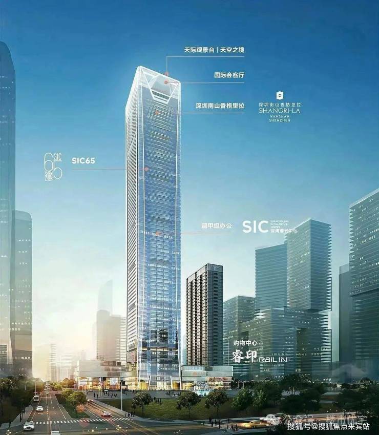 358米深圳第九高楼,深超总片区首个TOD商务综合体,集购物中心、五星级酒店、超甲级办公及私邸于一体,定位“全球城市灯塔地标”