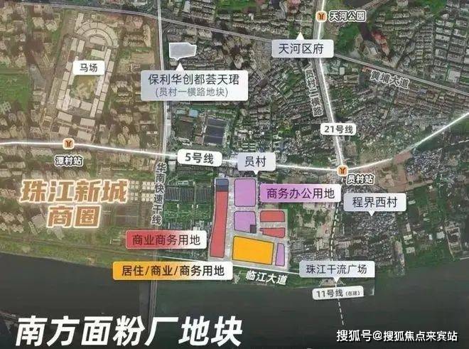 交通配套方面,地块位于规划花城大道南侧,周边紧邻华南快速干线、黄埔大道中、临江大道及科韵路等主要交通干道,交通四通八达。特别值得一提的是,该地块东北侧距离地铁5号线与11号线交汇的员村站仅150米,极大地提升了出行便捷性。