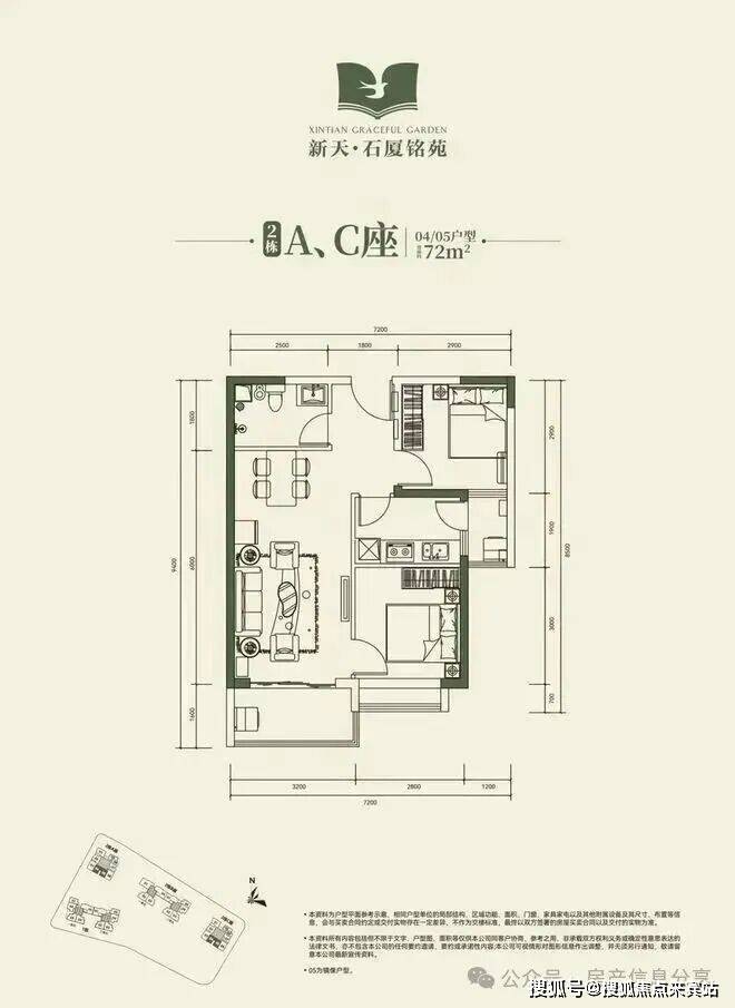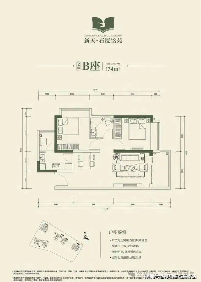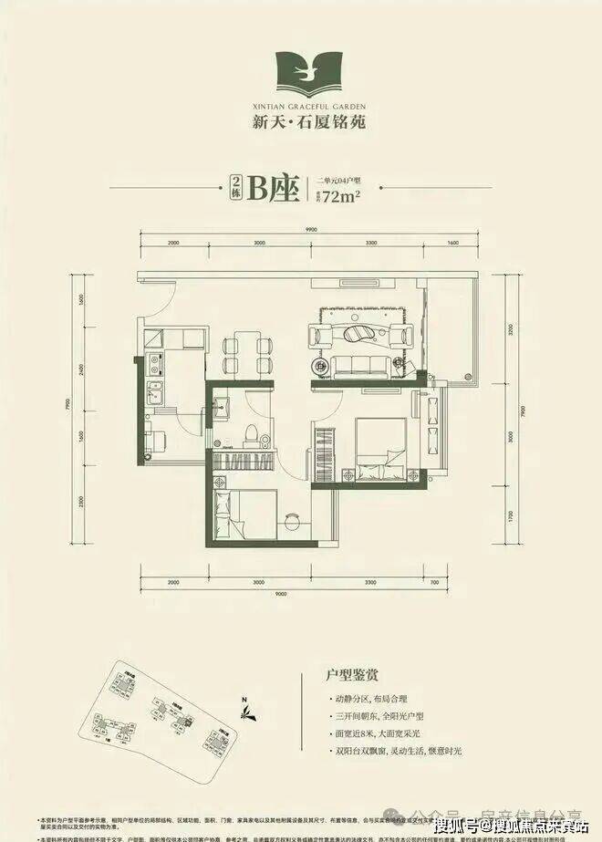 2栋B座二单元04、05户型:面积约为72-74㎡的2房2厅1卫。