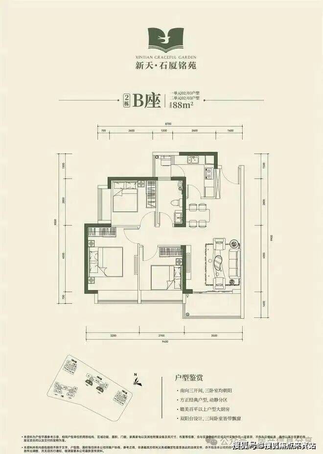 2栋B座一单元02、03户型、2栋B座二单元02、03户型:面积约为88㎡的3房2厅1卫;