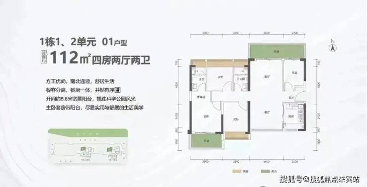 112㎡的4房2厅2卫,1栋1/2单元01户型,设计的是竖厅南北通透格局,进门入户玄关,客厅3.6米开间,实测高达23.88㎡餐客分离,餐厨一体设计,四开间朝南,主卧套房带阳台,分别做到了主卧17.21㎡/次卧9.55㎡/次卧8.1㎡/次卧5.72㎡(实测面积,去掉墙体),客厅连接次卧出9.28㎡的巨幕大阳台,U型厨房,卫生间干湿分离,得房率约:79.4-79.7%(不含赠送),阳台主朝东北向看科学公园。套内面积88.68㎡+赠送面积16.1㎡=实用面积104.78㎡,加上赠送后得房率约93.86%。