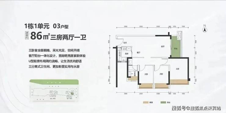 86㎡的3房2厅1卫,1栋1单元03户型,设计的是竖厅格局,客厅3.5米开间,LDKB一体化设计,进深10.05米,主卧全朝南,动静分区,分别做到了主卧11.67㎡/次卧8.64㎡/次卧8.46㎡(包含飘窗),U型厨房,卫生间三段式分离,得房率约:79.4%(不含赠送),阳台5.5㎡东南朝向。套内面积68.26㎡+赠送面积8.5㎡=实用面积76.76㎡,加上赠送后得房率约89.33%。