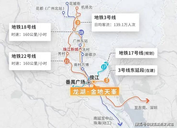 3号线东延段傍江站地铁上盖,可直达珠江新城和白云机场。一站番禺广场,在番禺广场接驳18号线和22号线,另外规划中有17号线。