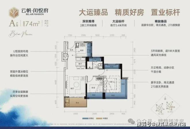 74㎡2房2厅1卫:设计的是经典竖厅格局:,进门入户玄关,S墙预留冰箱位,客厅3.4米开间,U型厨房,三开间朝南,主卧南北通透270度景观,卫生间干湿分离。
