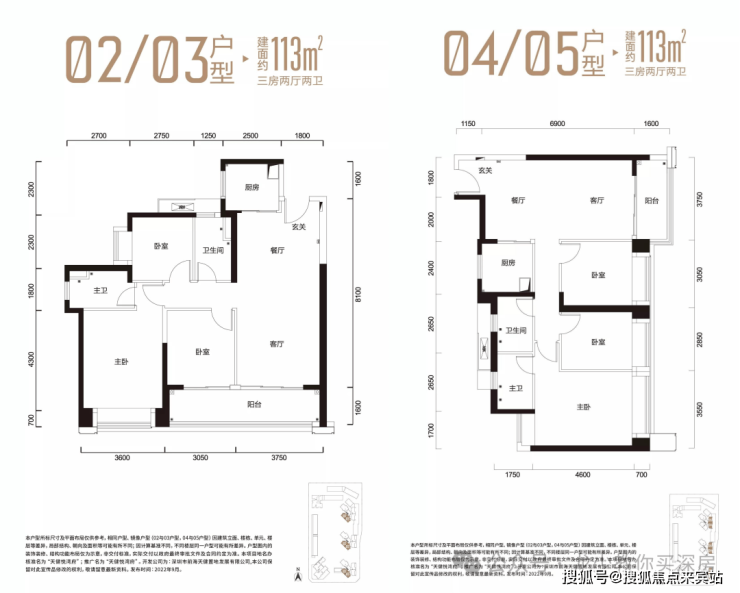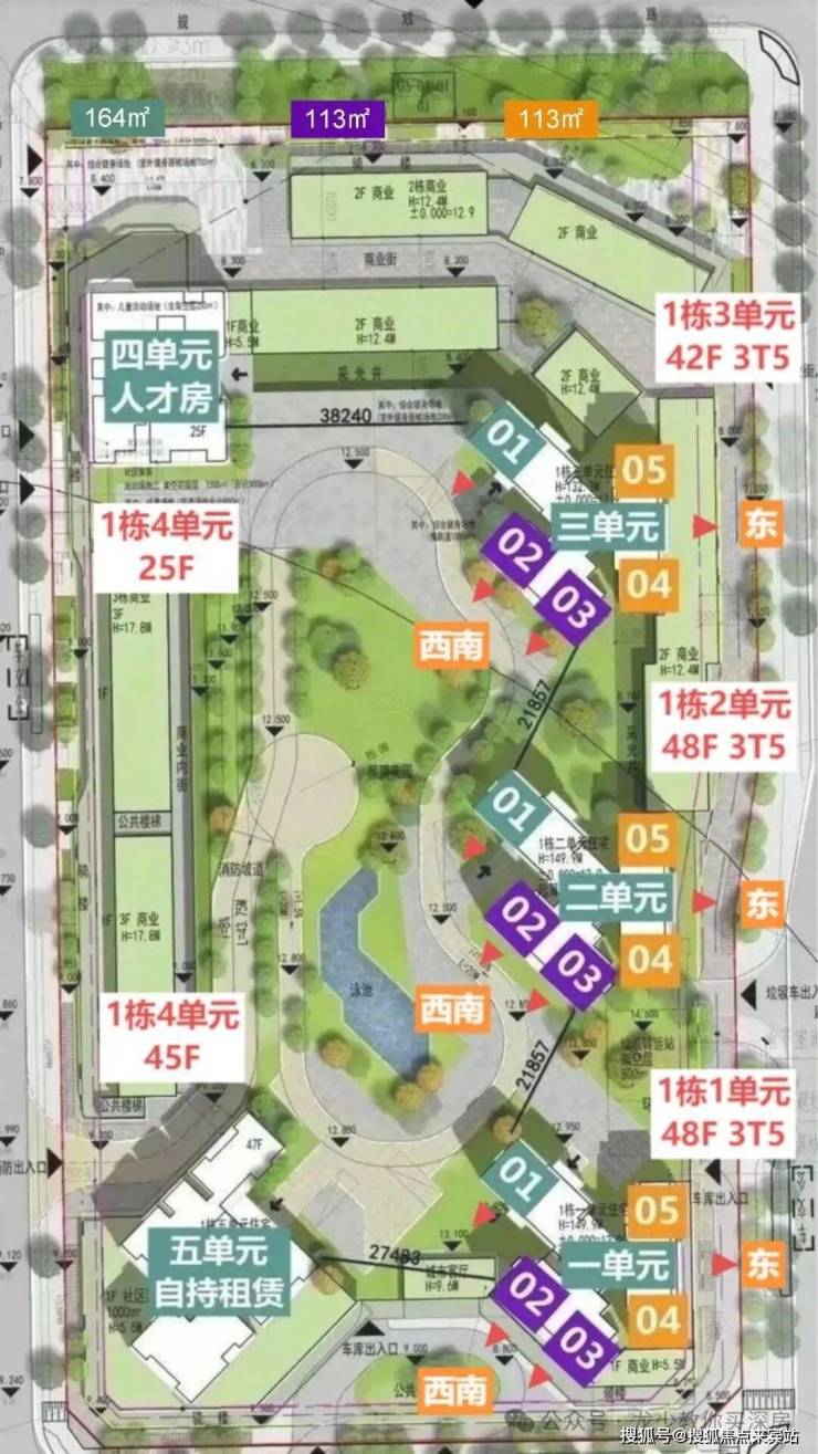 3栋住宅42-48层,均为3T5户,主打改善,共3个户型,分别为113m²竖厅3房(西南向看花园),113m²竖厅3房(东向看写字楼/城市绿廊),164m²双阳台(南北通透看花园)4房。