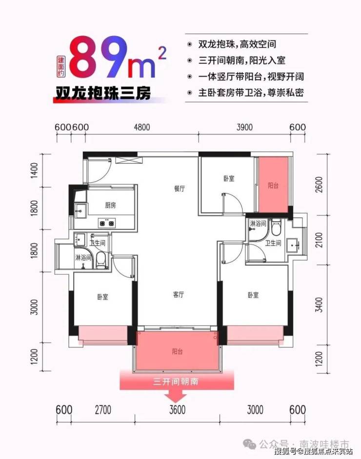 户型:建筑面积约89㎡三房两厅两卫,东南朝向,双阳台,主卧套房设计